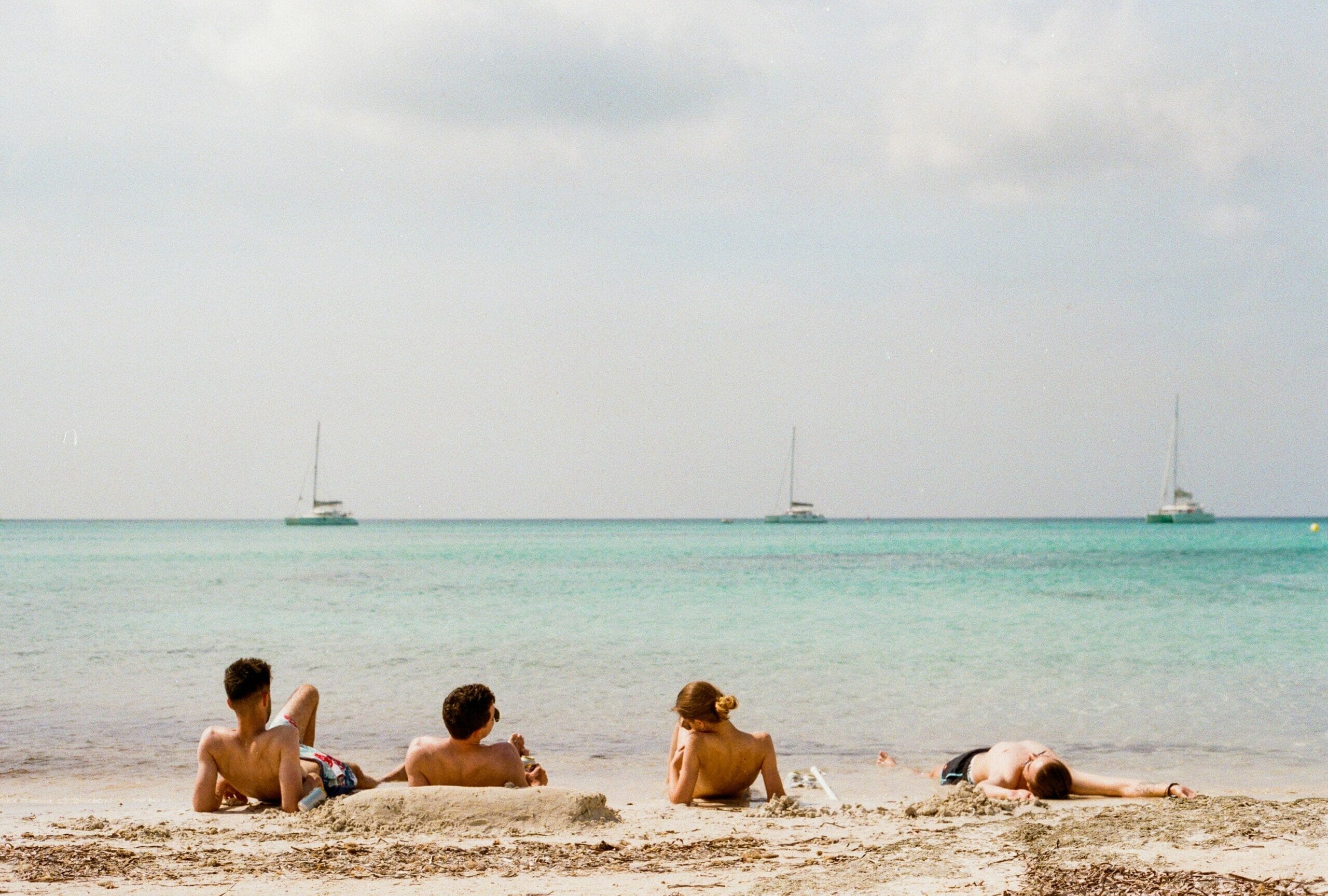 four people relaxing at the beach with view on the ocean and three yachts in the distance